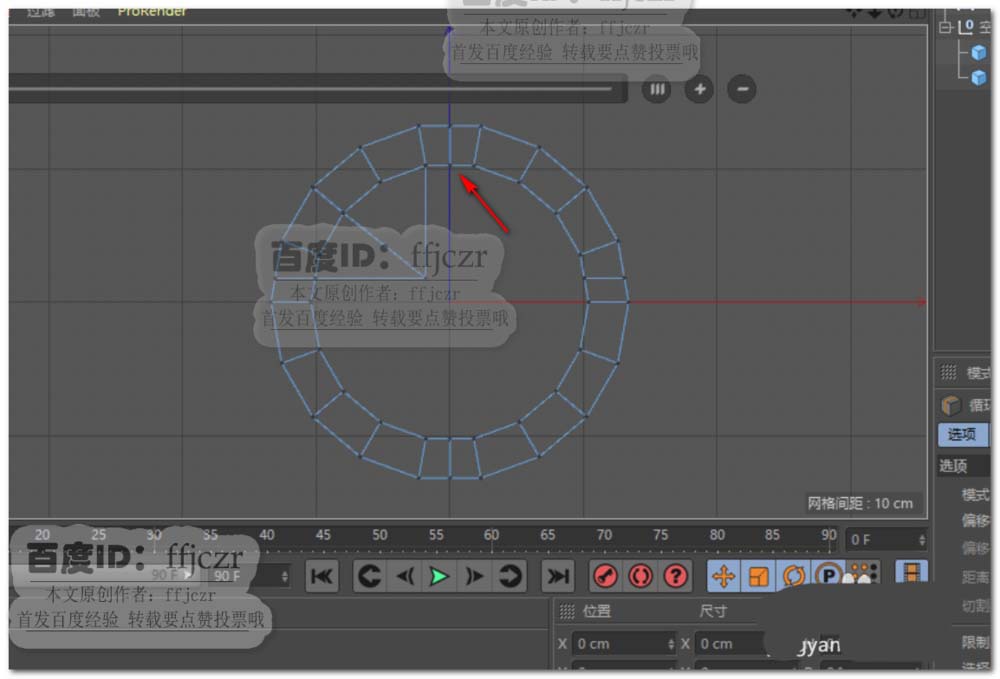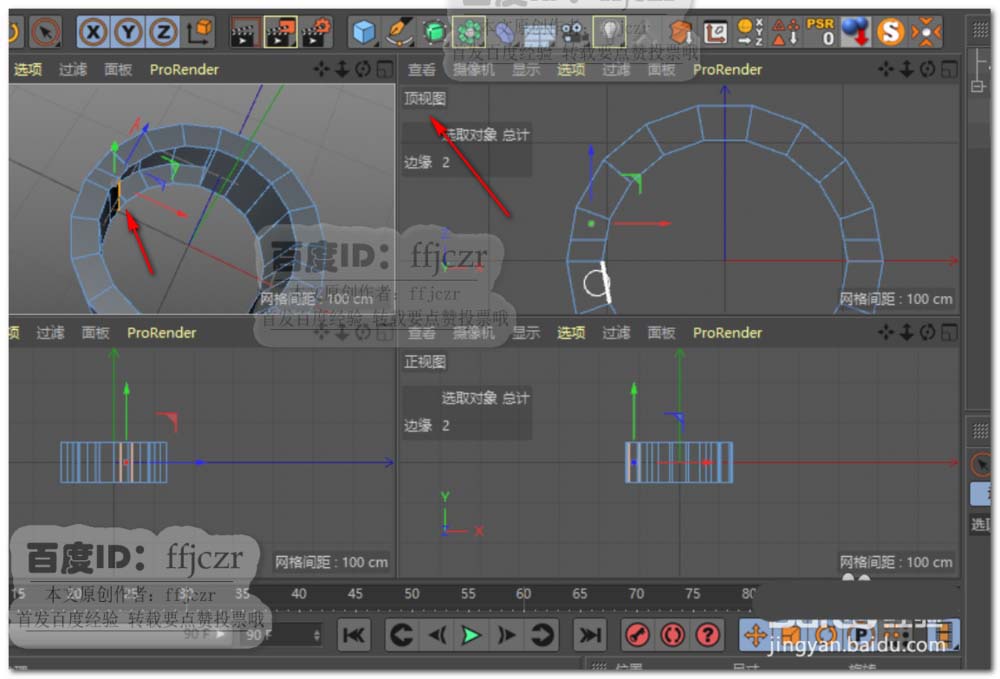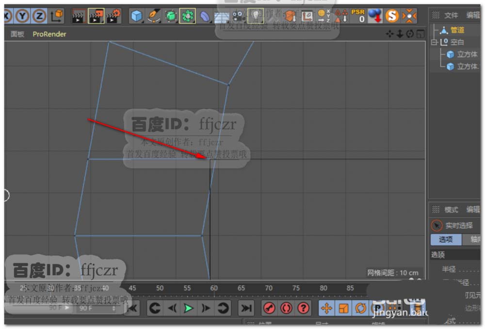 3、从顶视图中可以看出,参考十字形与圆管的左侧相差一条结构线。用切刀工具添加相应结构线。如图所示。