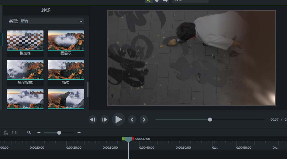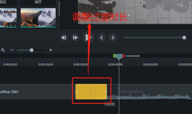 6、调整完过渡的时长之后,播放时间轴,观察过渡效果,就可以看到时间轴从梯度擦拭过渡到下一视频素材了。