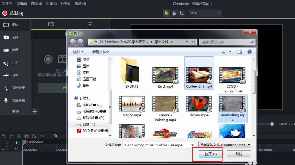 1、先来新建一个Camtasia 9项目,然后在新Camtasia 9项目导入素材,弹出“打开”窗口。