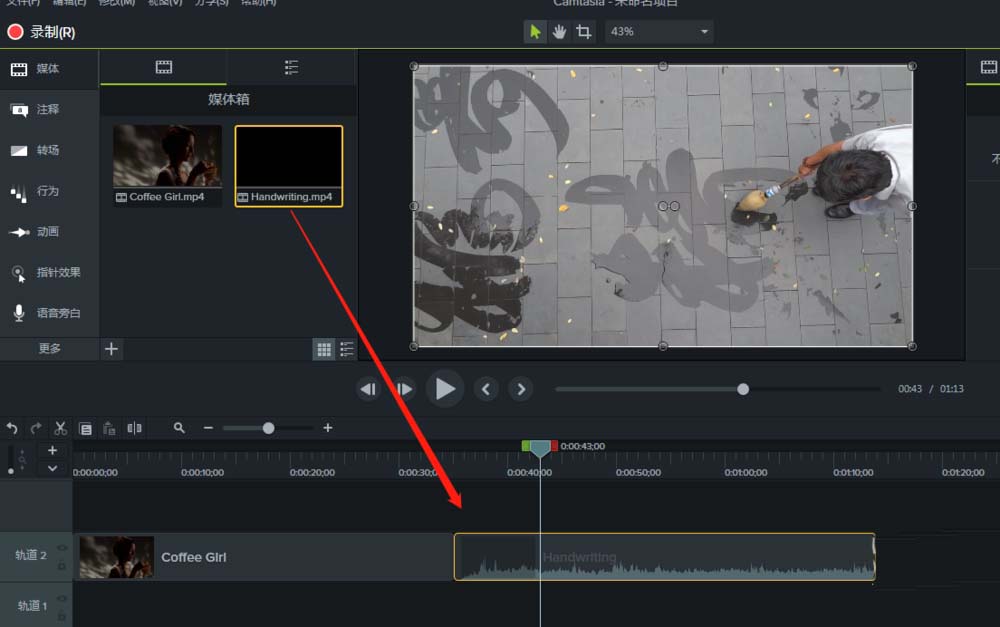 3、选中导入的视频素材文件,将它选中按住鼠标左键不松移动到时间轴的某一个轨道中。