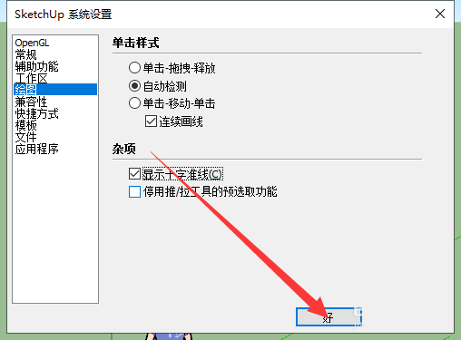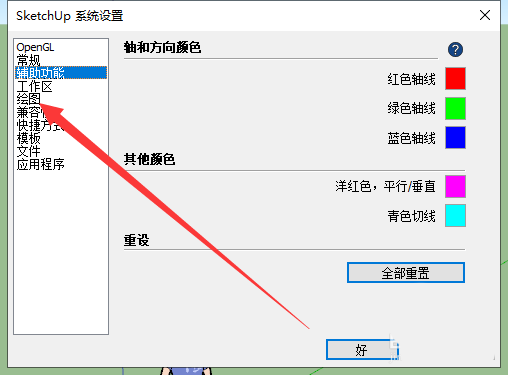 3、然后打开SketchUp系统设置对话框中的左栏的选项中选择单击“绘图”选项。