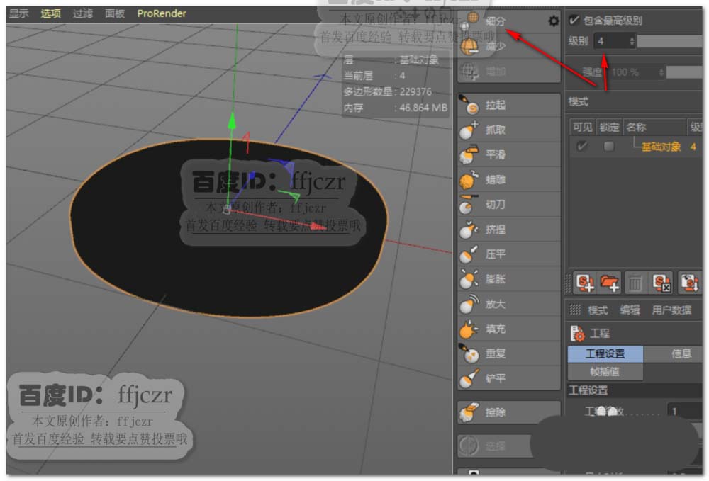 3、转到雕刻界面(sculpt),处于选中模型的状态下,给模型添加4次细分;使模型得到非常多的小面。