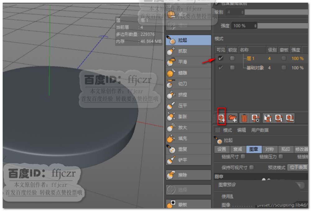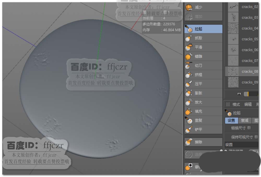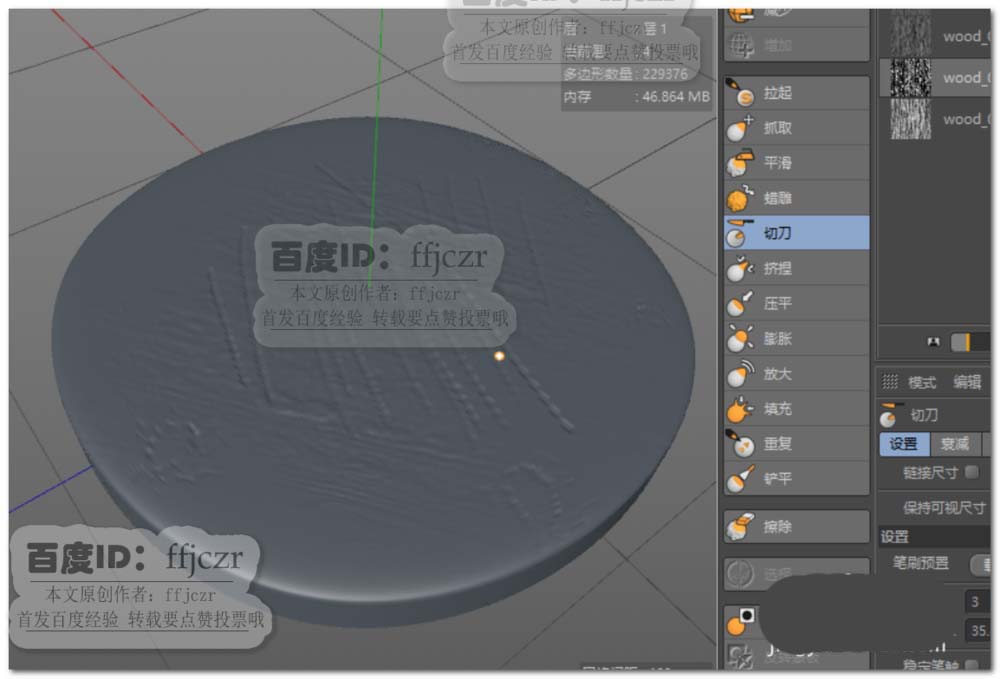 4、在模式中,新建一个层;选用拉起工具,在预设中选用划痕笔刷,在案板的表面上添加各种不同的划痕。也可随意在该面上进行各种细节的添加,这是在简面模型中做不到的。