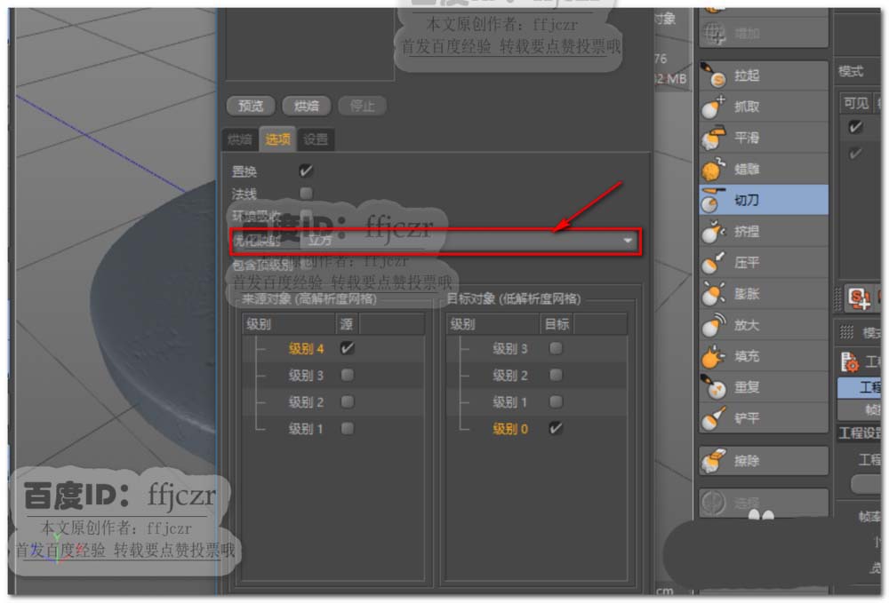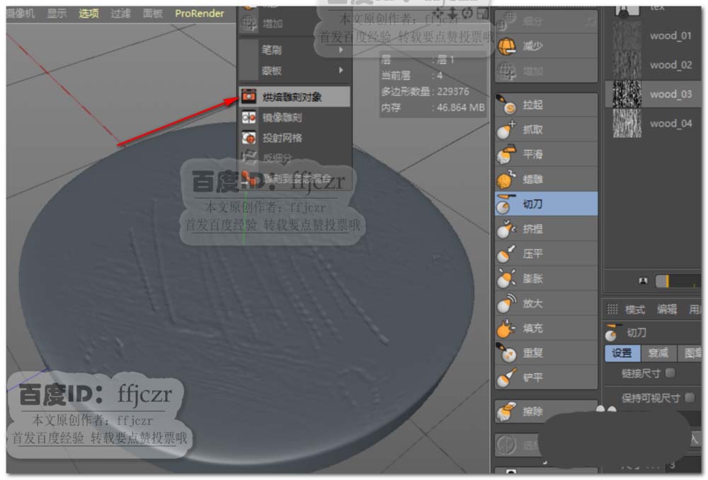 5、细节添加完后,点开雕刻菜单,选择其中的烘焙雕刻对象。