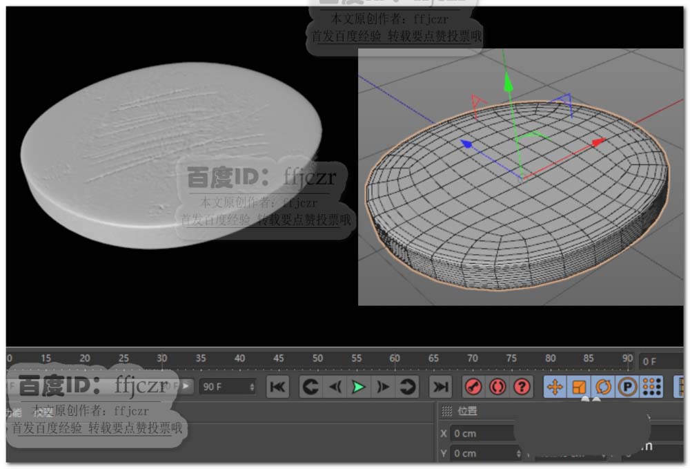 7、回到常用的建模界面,可以看到对象栏中多出了一个多边形,其中带有雕刻标签的多边形是添加了4次细分的曲面‘将其隐藏。在另一个多边形上软件自动添加了一个带有置换贴图的材质。在没有渲染时可以看到其表面只有极少的结构面,点渲染,表面却可以得到复杂的细节效果,这正是所要的。