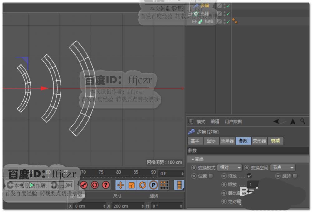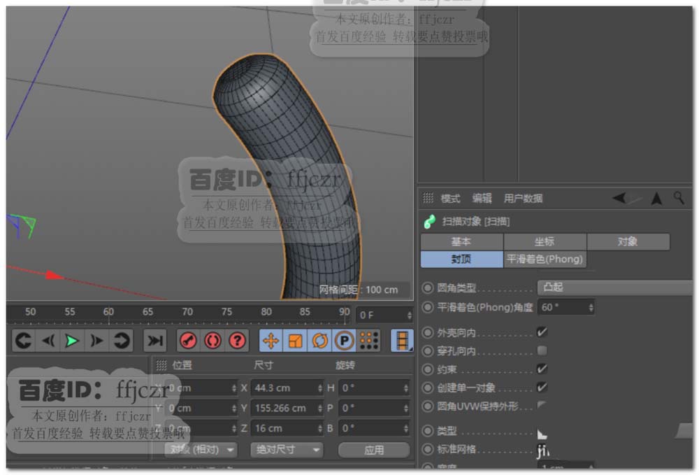 3、将圆环与圆弧拖到扫描的子级中,扫描顶端和末端更改为圆角封顶,步幅为3,半径为5,圆角类型为凸起。