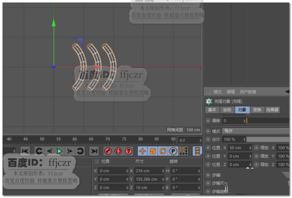 4、给扫描组添加一个放射克隆,数量为3,在X轴上数值为50.