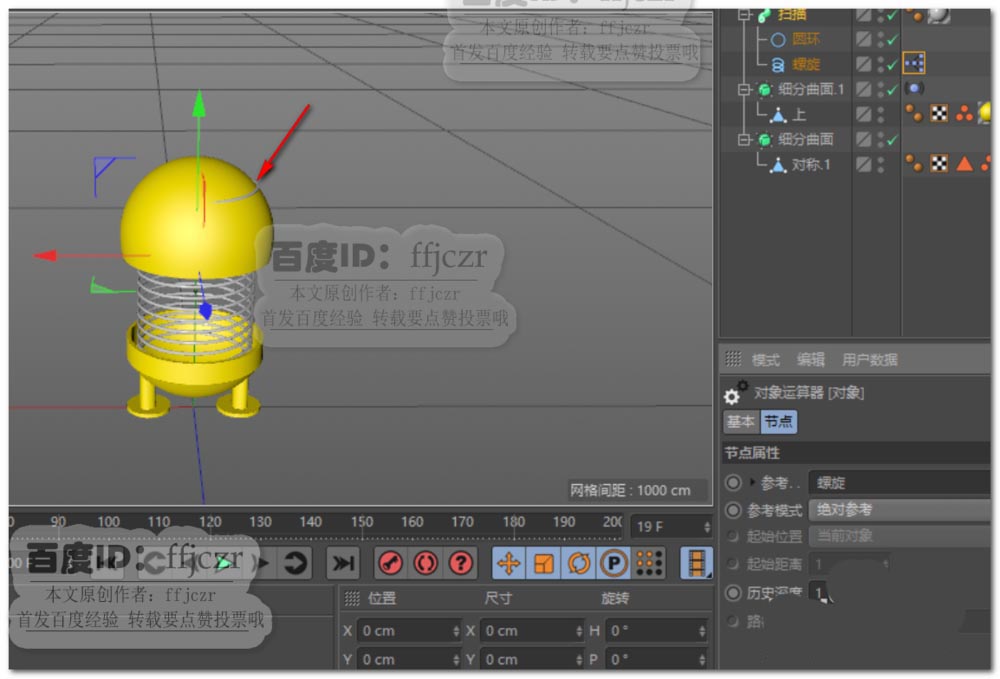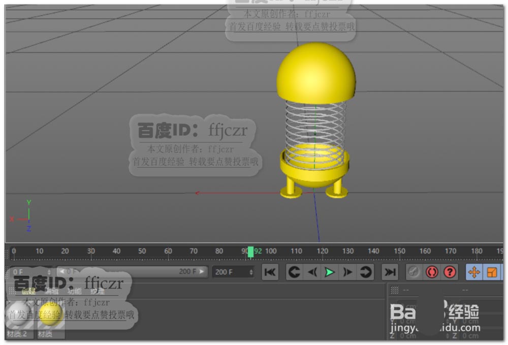 1、不知道怎么建模的朋友可以参考弹簧摆件的建模方法。给上下半球添加了一个黄色材质,给弹簧添加了一个白色材质,只是加了颜色。方便后面的查看。