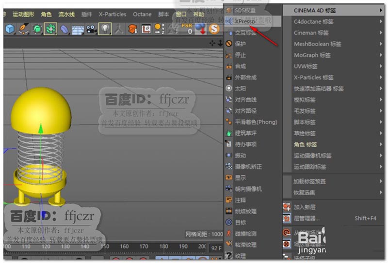 2、这里先说一下在不用动力学的情况下如何实现弹簧的动弹动效:原理是用上半球Y轴上的数值来控制弹簧的高度。选中弹簧,添加一个XPresso标签。