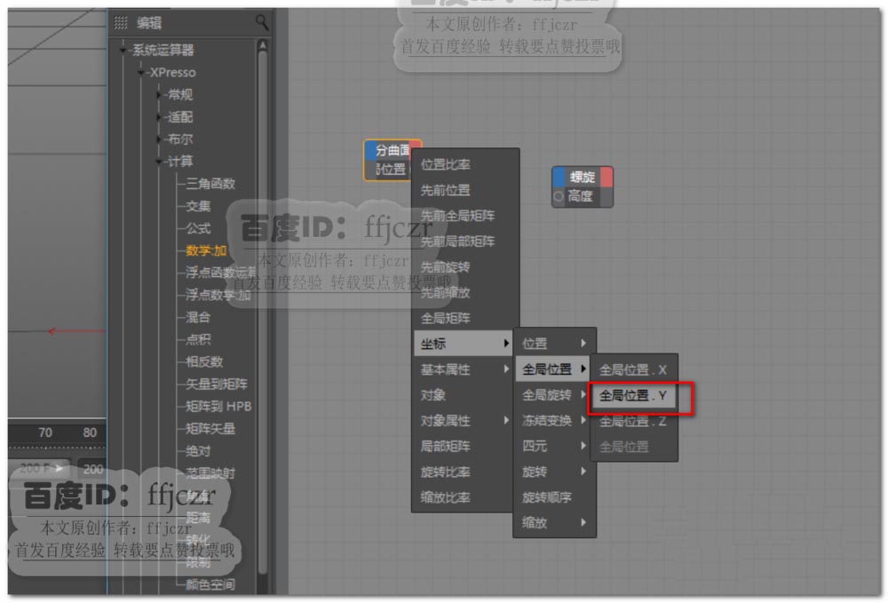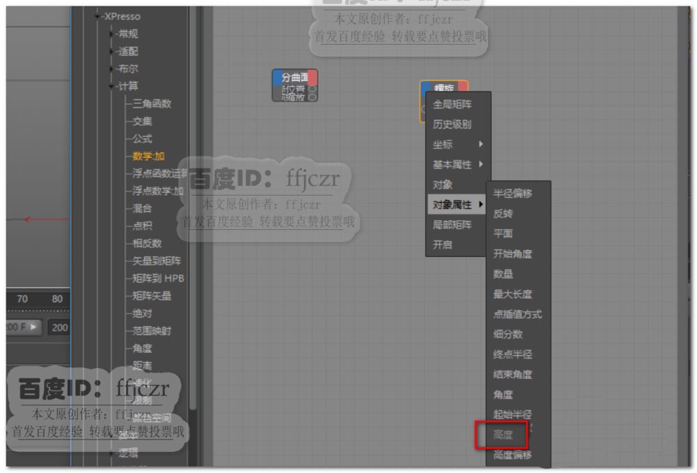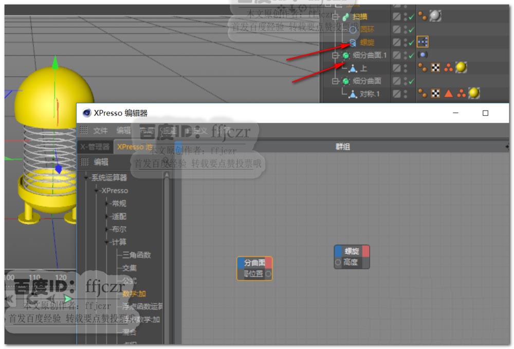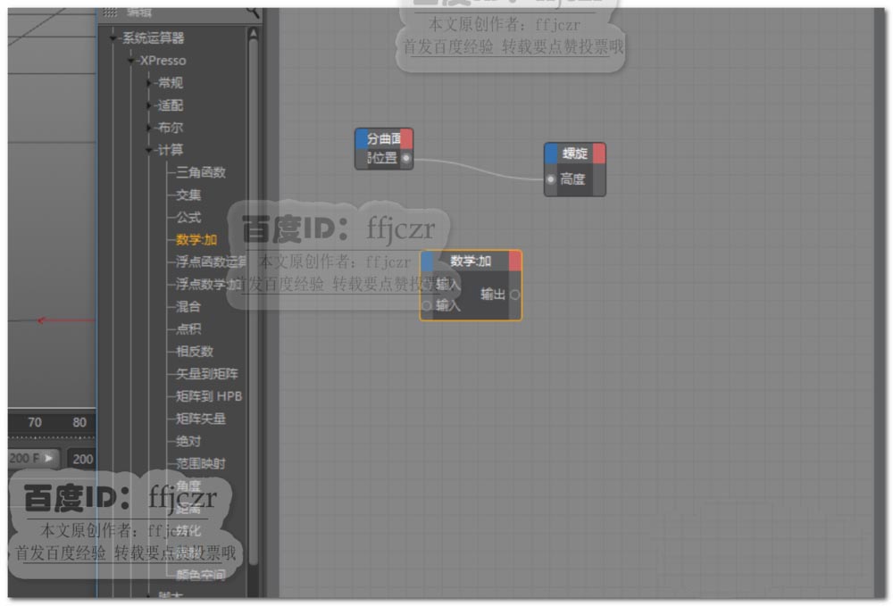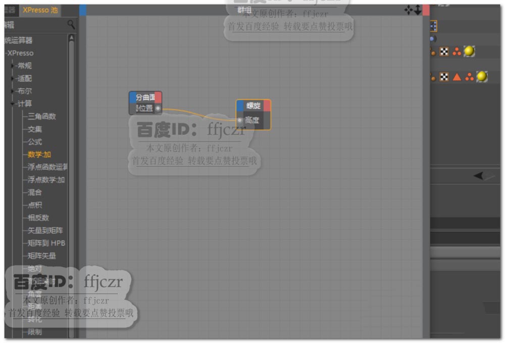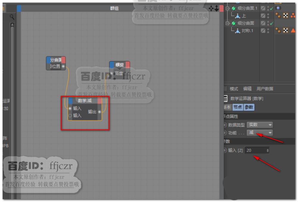 7、XPresso池中添加一个数学减,输入数值为20.将细分曲面的数值输入到数学减,经过数学减处理后的数值输入到螺旋线的高度中。此时点播放,即可得到正确的动弹效果。