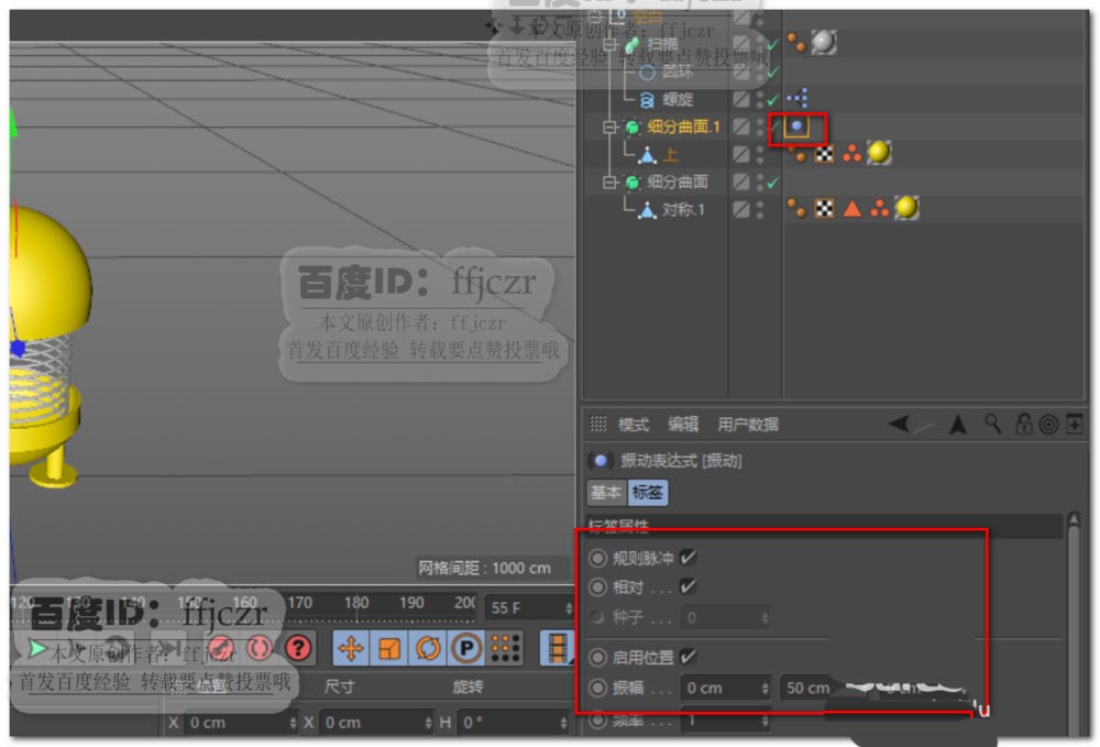 3、在编辑XPresso前,先给细分曲面添加一个振动标签,勾选规则脉冲与相对,启用位置,更改振幅值为Y轴50CM。这样上半球就拥有了在Y轴上变化的数值。将螺旋线和上半球(细分曲面)拖入到XPresso池中。