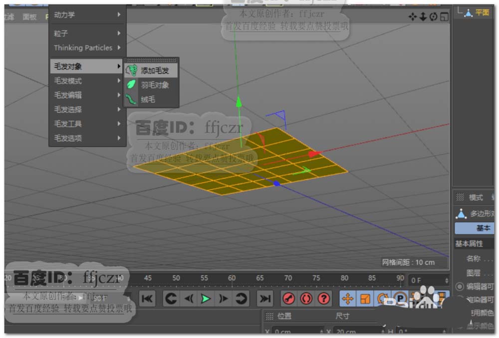 2、在保持多边形平面选中的状态,点开模拟菜单选择毛发对象中的添加毛发。