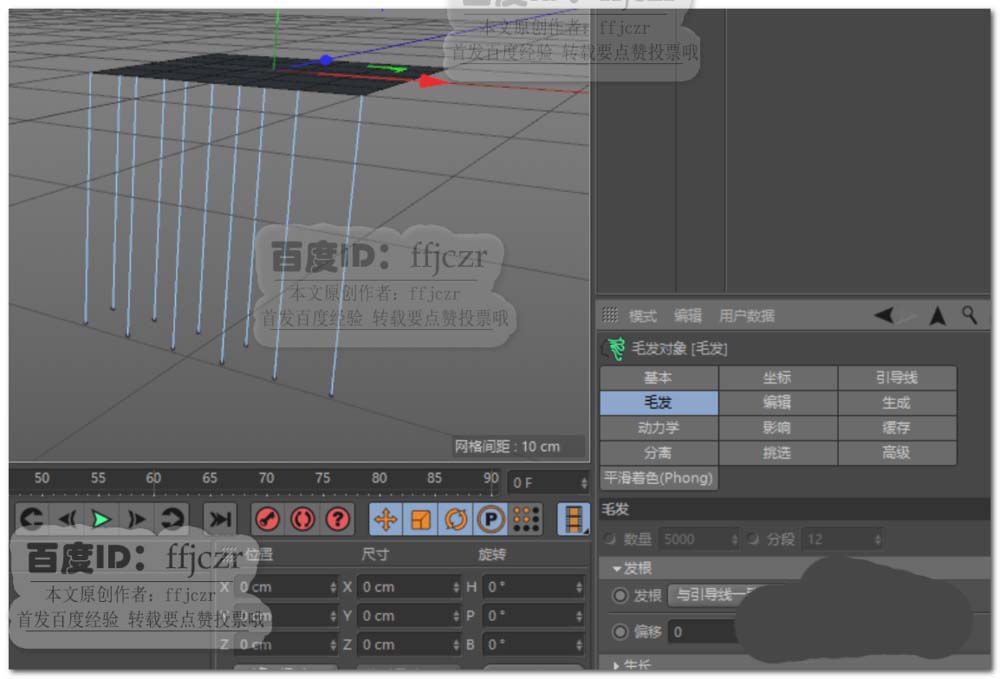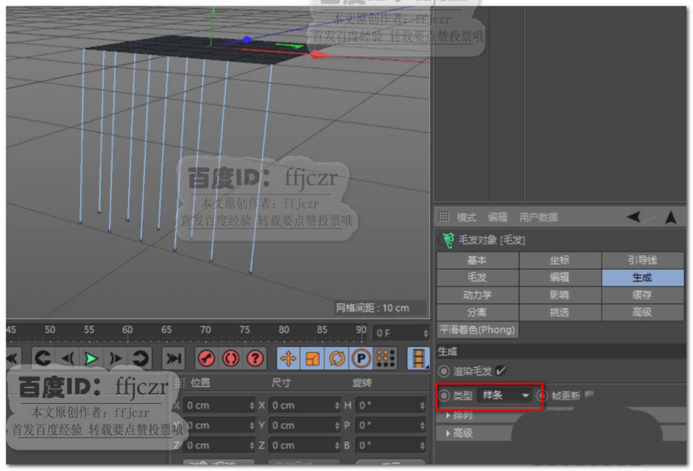 3、调整毛发对象的参数,将生成项中的类型更改为样条,毛发项的发根更改为与引导线一致;引导线项中将数量更改为10,分段为20,长度为100.