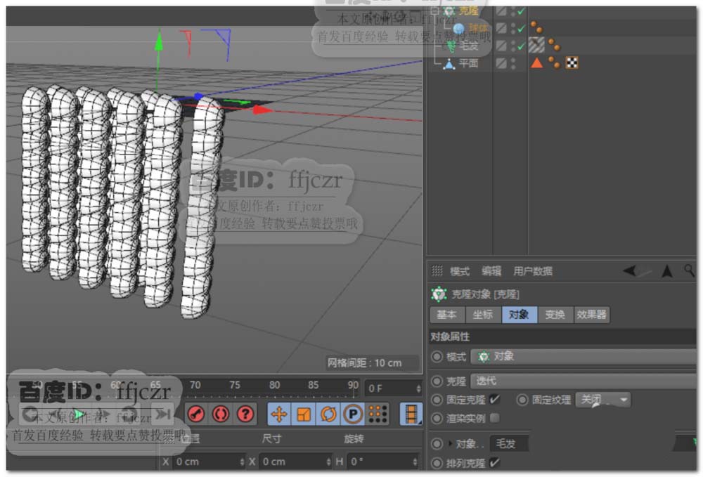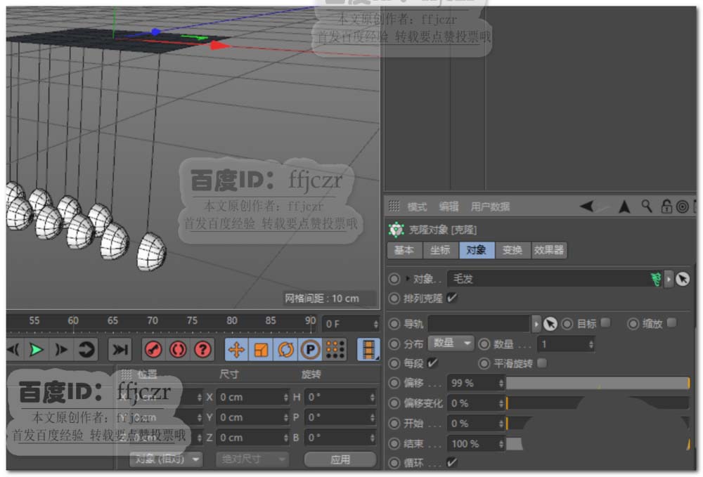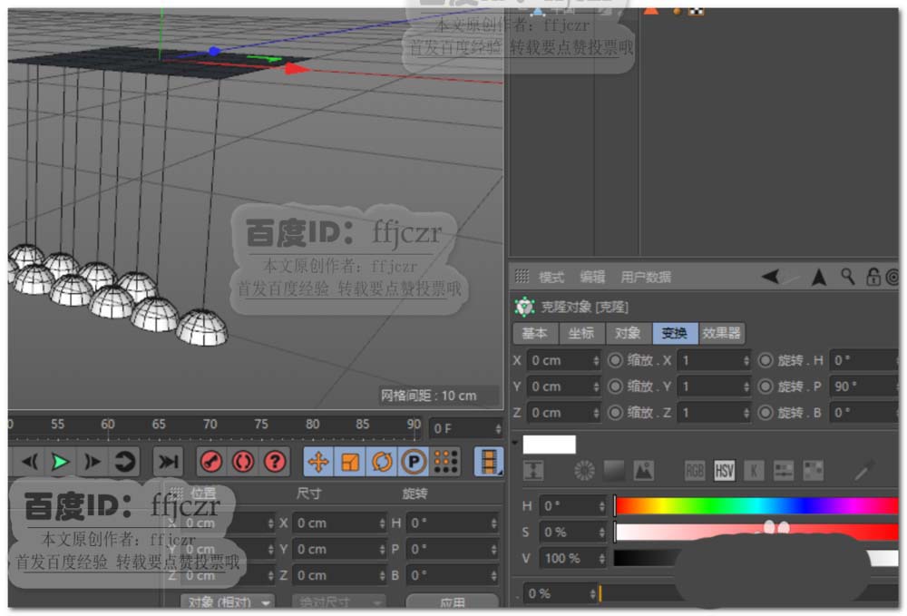 6、在克隆属性变换选项中将旋转P值更改为90度。即可得到挂在样条线上的风铃效果。