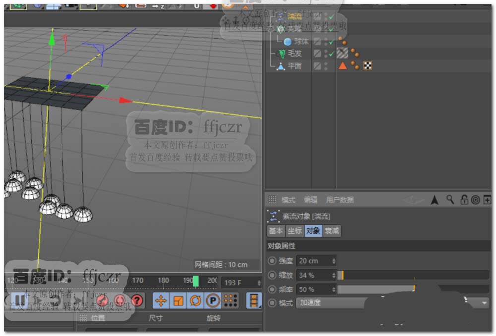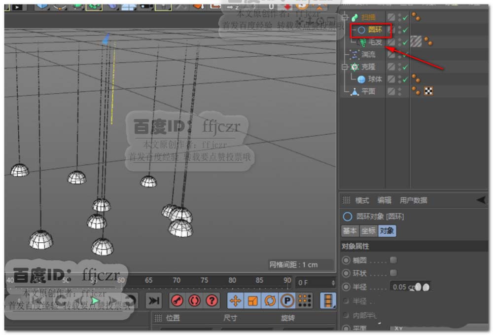 8、创建一个半径为0.05的圆环,将圆环与毛发拖到扫描的子级。即可得到可渲染的细绳。点播放即可看到风铃摆动的动态效果