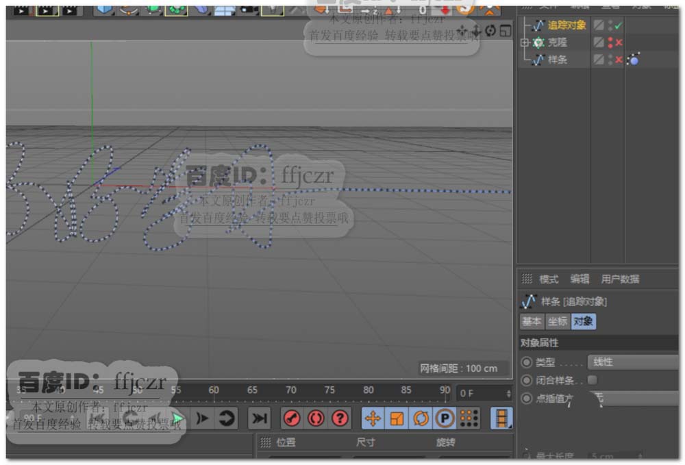 3、给克隆添加追踪对象,追踪模式为连接所有对象,取消追踪顶点;将追踪对象转为可编辑多边形。得到一条点数分布均匀的样条线。保留得到的样条线,其它隐藏。
