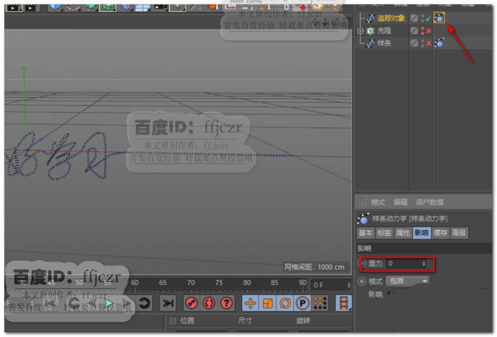 4、给上步的样条线添加样条动力学,将样条动力学影响项的重力更改为0。