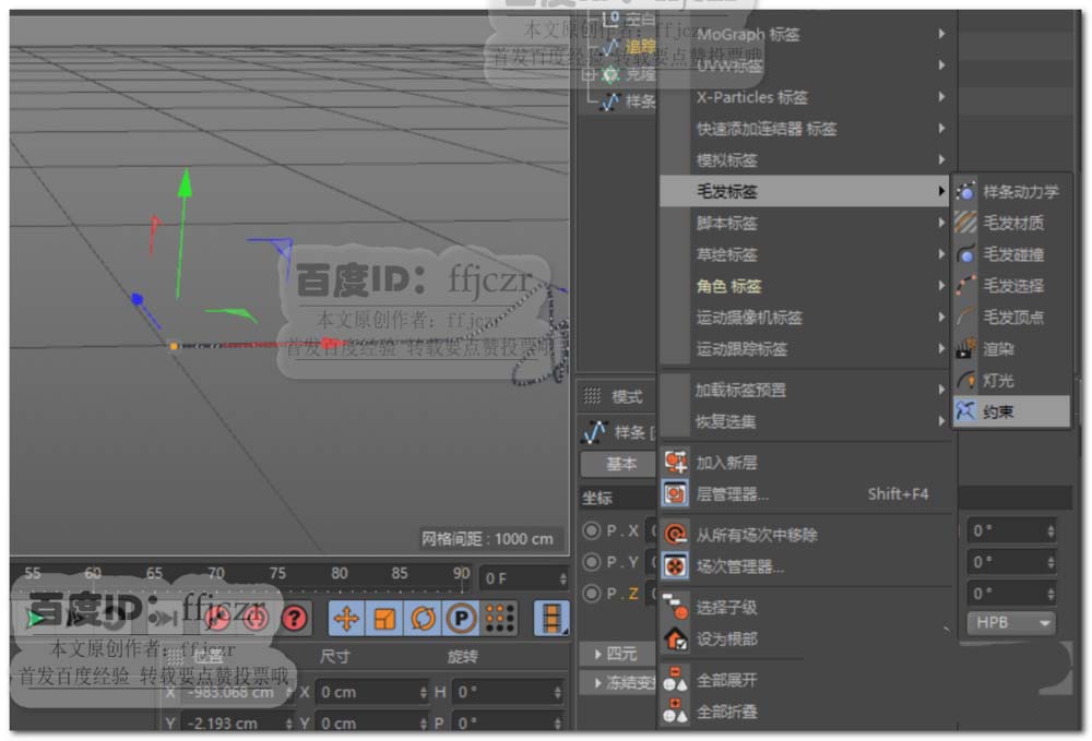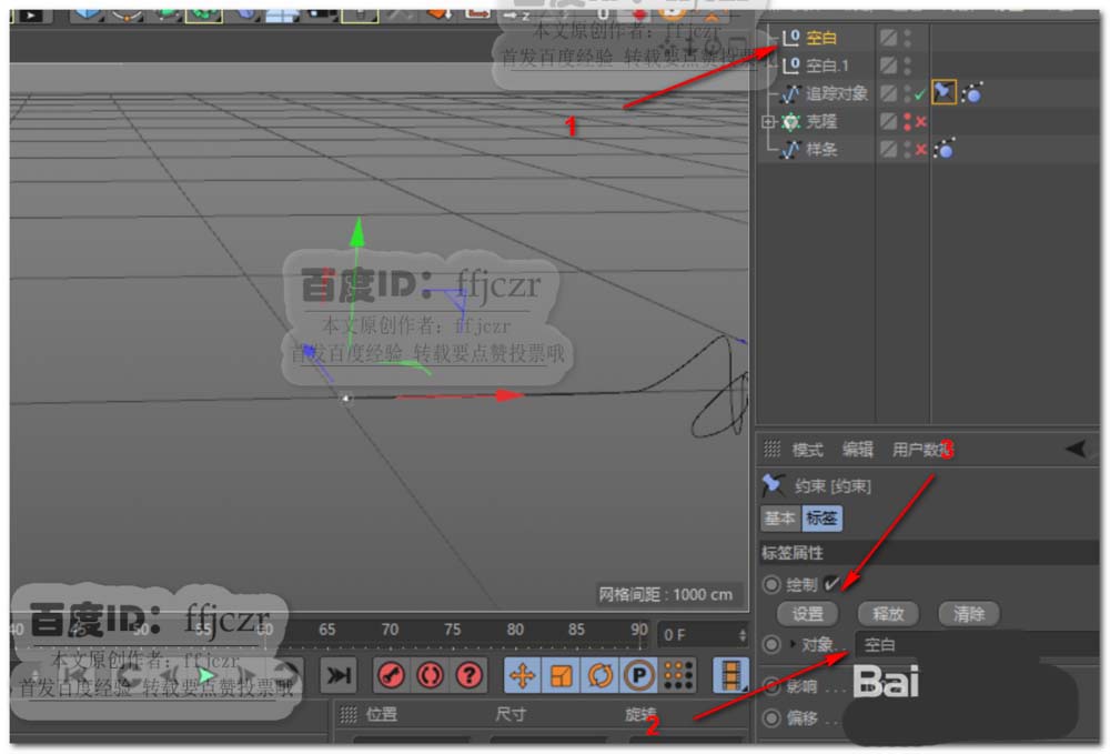 6、空白对象与端点的约束。选中左侧端点,给样条线添加毛发标签中的约束标签,将空白对象拖至约束标签属性中的对象项中,点设置。样条线左端点即被约束到空白对象上。另一端也是如此操作,将端点约束到另一空白对象上。