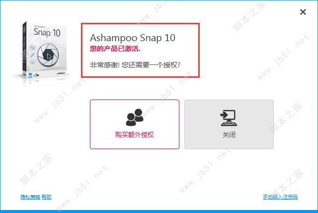 以上就是脚本之家小编给大家分享的Ashampoo Snap(屏幕截图/录屏工具)免费版激活教程了,建议用户在本网站下载激活,毕竟是最新版本,之前的旧版本不一定能够完美激活。