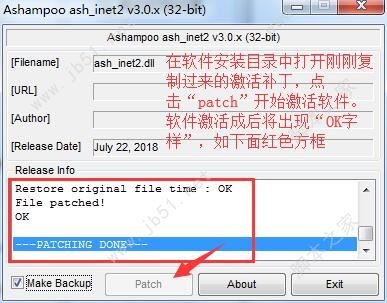 10.复制完成后,在软件安装目录启动“ashampoo.ash_inet2.v3.0.x.(32-bit)-patch.exe”激活补丁,打开后,点击“patch”开始激活软件。如图