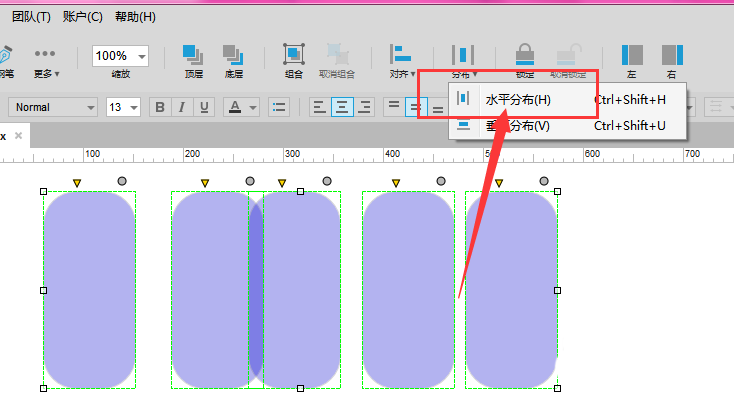 5、这样选中的元件,会在水平方向上平均分布,如图所示