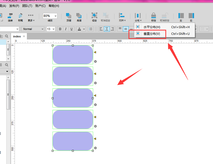 6、同样的如果是垂直方向的多个元件,需要选择分布中的垂直分布才可以。