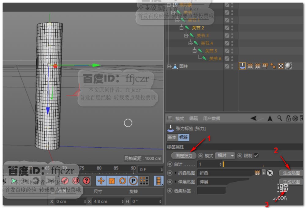 4、将模型回复到原来没有弯曲的状态,点击张力标签中的固定张力,再点击折叠贴图和伸展贴图中的生成贴图。如图所示。