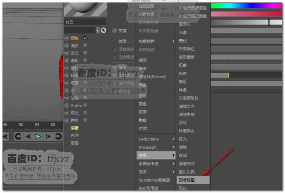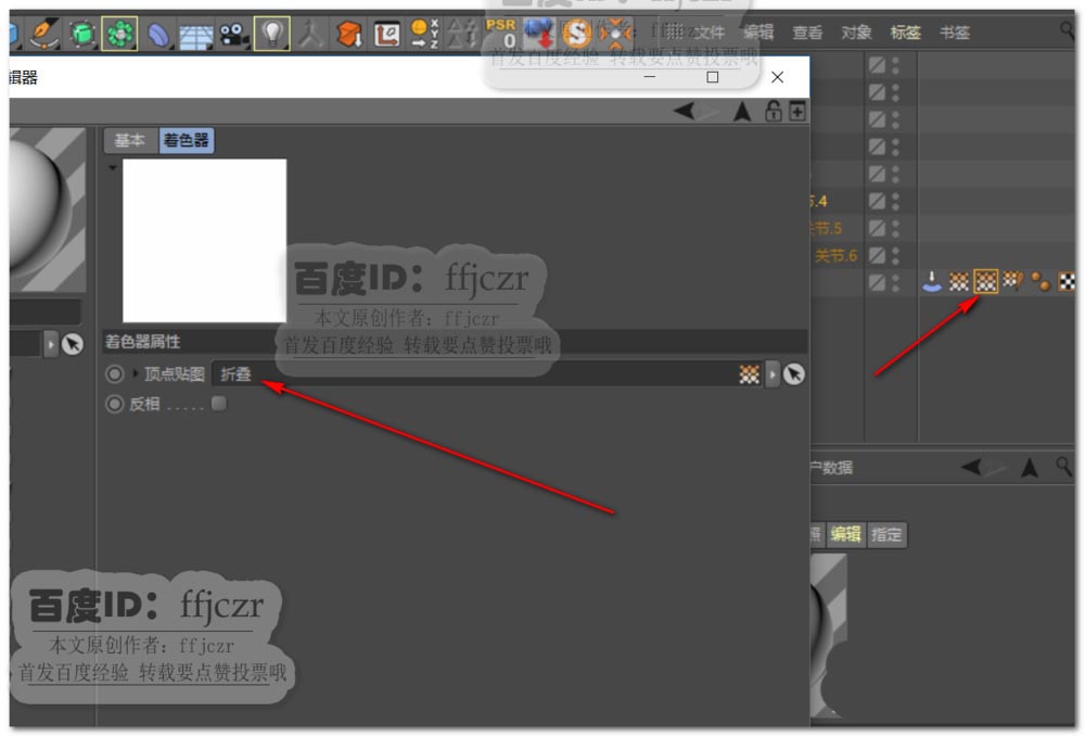 6、创建一个材质,在颜色通道的纹理中添加效果中的顶点贴图。将上步生成的折叠顶点帖图拖到顶点贴图项中。此时渲染模型可得到一个只有折叠地方显示白色的图。