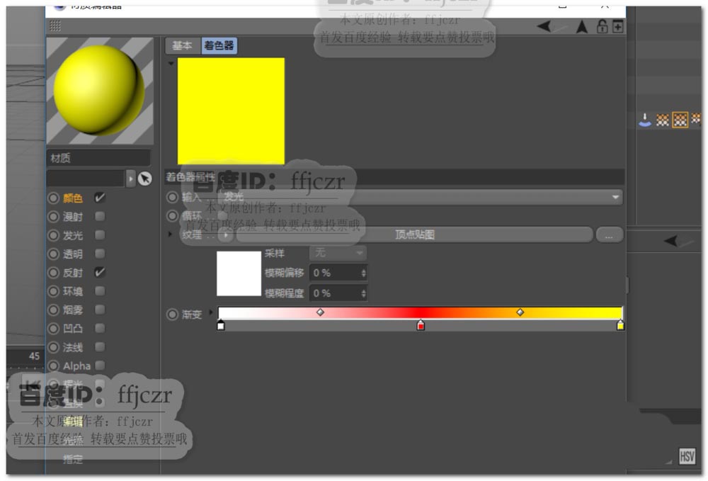7、在材质颜色通道的纹理中再添加一个着色效果,在着色器中更改颜色;其中左边的第一个颜色为模型本体颜色,后面为折叠处逐渐过渡的颜色。如图进行更改颜色后即可得到图3所示的渲染效果了。