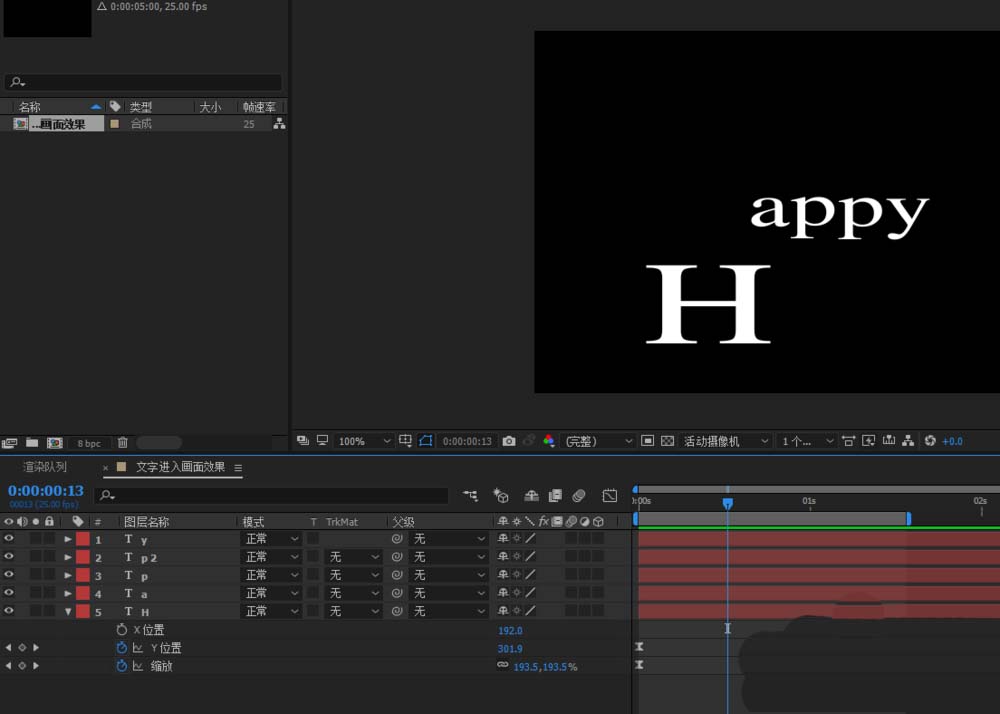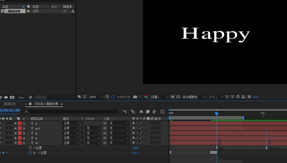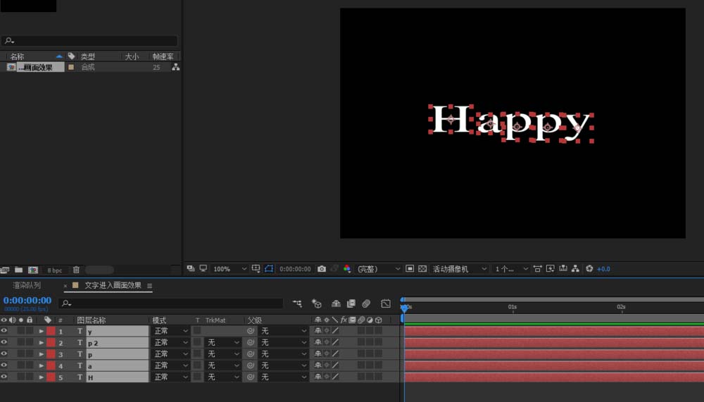 2、CTRL+T 输入想要的文本内容;Happy;五个字母单独为一层;中心调整至相应的字母中心处;