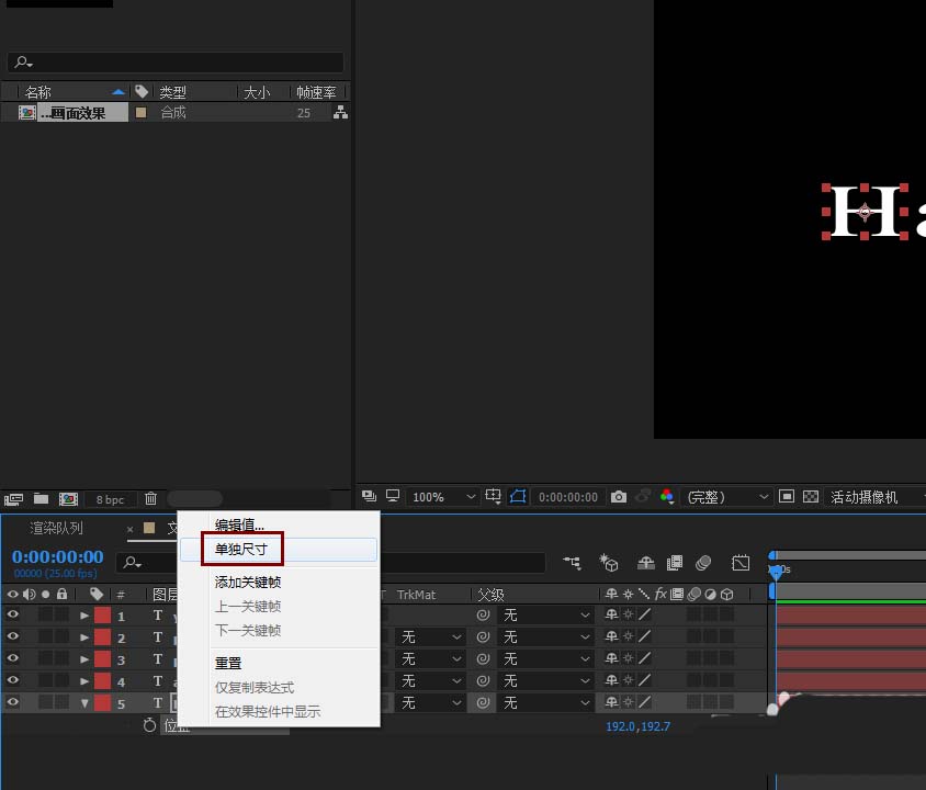 3、首先对字母H的动向进行设置,P键打开位置属性,将位置的X.Y属性右击单独设置(单独尺寸);