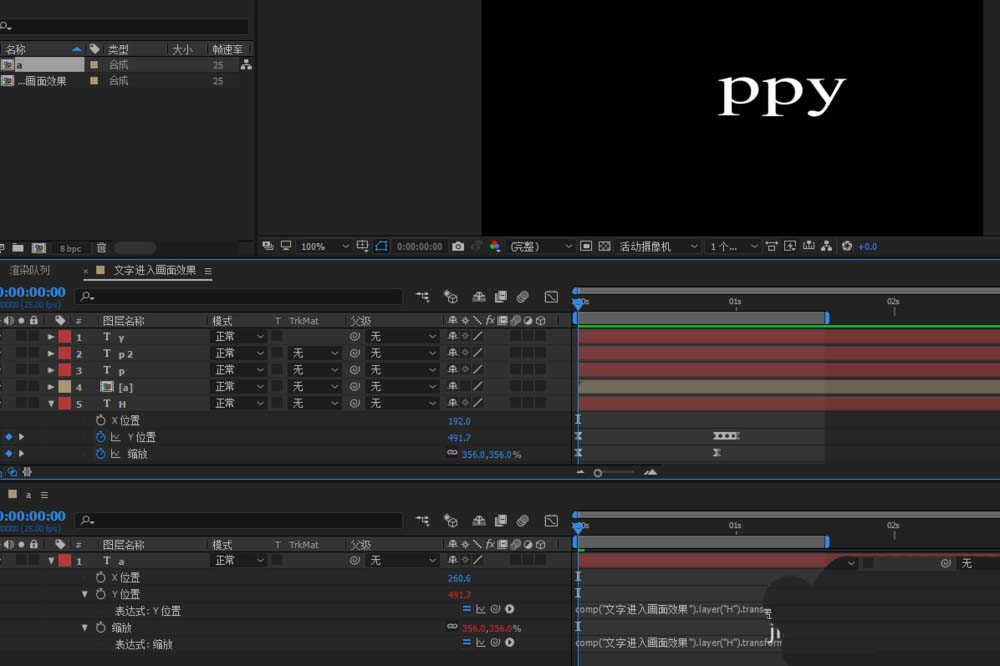 6、a字母预合成Ctrl+Shift+C,然后双击进入预合成a里面,把a窗口拖移到这个画面中的底部形成上下的位置,这样方便我们进行表达式的关联,同样将a字母的P进行x.y的分离,按住Alt键来点击Y轴前的小秒表,将Y跟H的Y进行关联,同样的方法将缩放关联一下;这样两个属性的表达式都关联成功了;H和a的效果一模一样,通过错开显示时间,剩下的字母做同样的操作,利用系列图层知识点将两两字母之间间隔时间错开一样就好。