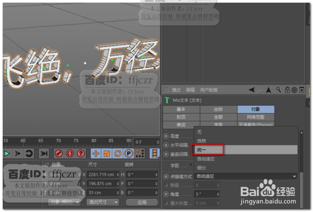 2、更改文本内容,这里借用古诗江雪中的内容:千山鸟飞绝,万径人踪灭。调整对象中的点插值方式为统一,封顶中的类型为四边形,标准网格;使文本的所有文字都产生较为均匀的网格。如图所示。