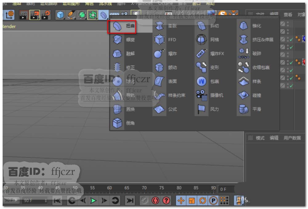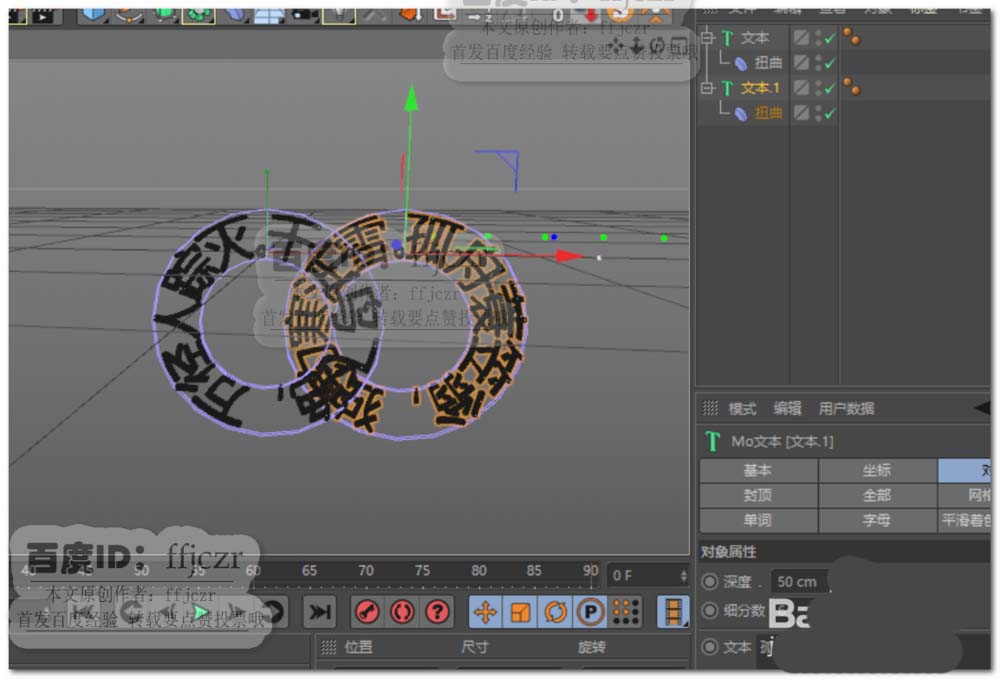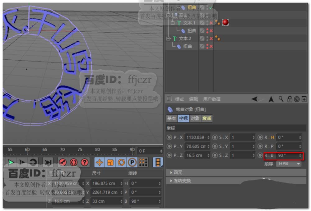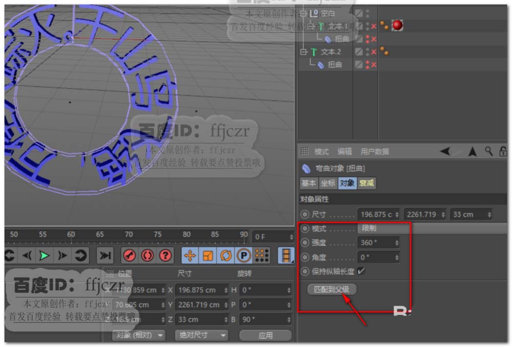 4、调整变形器在坐标中Z轴的角度,值为90度;在对象属性中点匹配对象;强度为360度。勾选保持纵轴长度。这样就可得到一个由文本组成的圆环了。