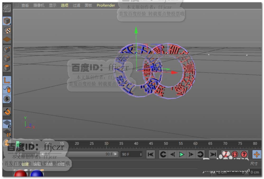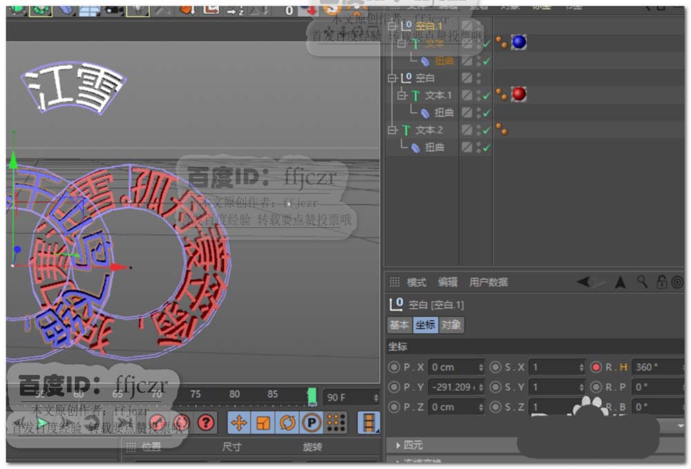 8、分别创建空白对象X轴上的旋转关键帧。时间为0时RH为0,时间为90时RH为360。这样就可以得到二个旋转的圆环了。