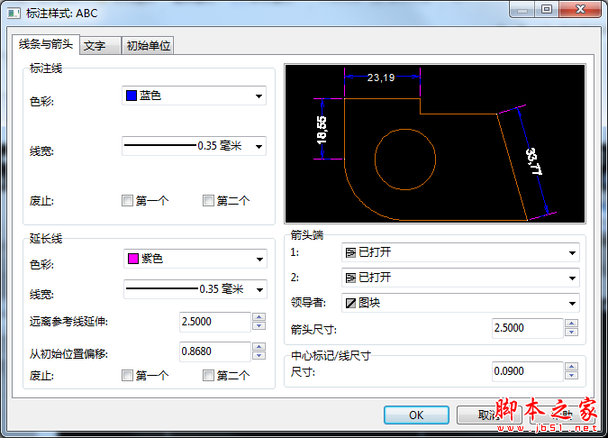 在标注样式编辑窗中能对当前的标注“线条与箭头”、“文字”、“初始单位”进行设置修改。设置完成后,点击“OK”。