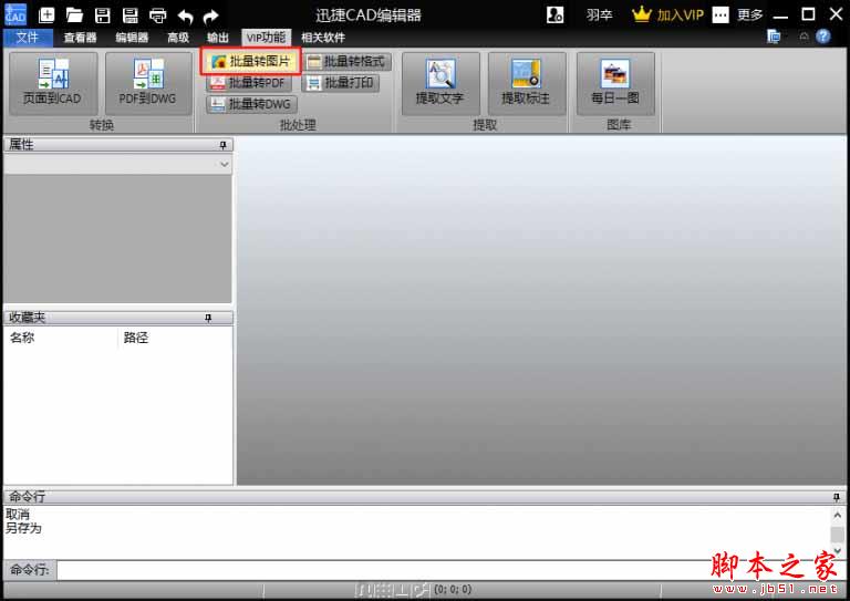 1.先启动迅捷CAD编辑器标准版,然后直接在菜单栏里选择【VIP功能】选项,在【VIP功能】页面里的【批处理】工具栏中有各 种批量操作的工具选项,我们选择点 击【批量转图片】,这时候会弹出【批处理】弹窗页面。