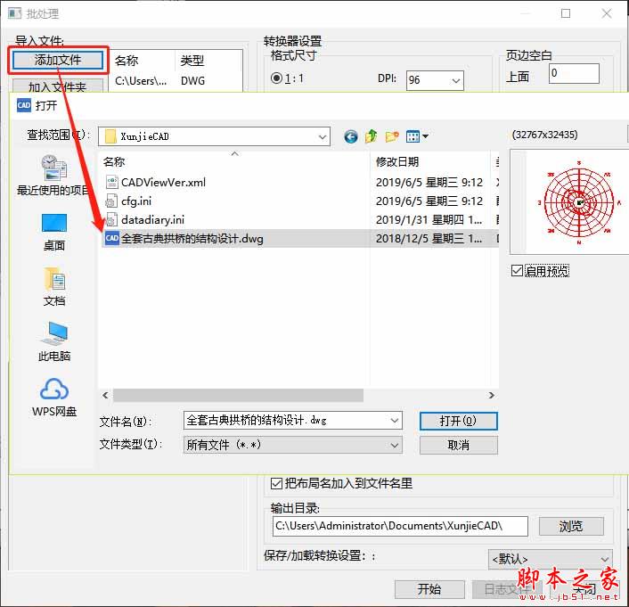 ①可以选择点 击【添加文件】,在弹出的【打开】次弹窗里找到需要转换的CAD图纸添加到【批处理】页面。