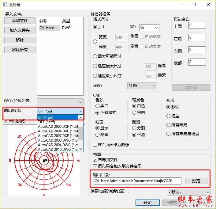 3.添加好需要转换的CAD图纸文件后,我们在【输出格式】栏里选择【GIF动图格式】,之后可以在【转换器设置】里对【格式尺寸】和CAD的色彩、背景色、布局等做需要的设置。