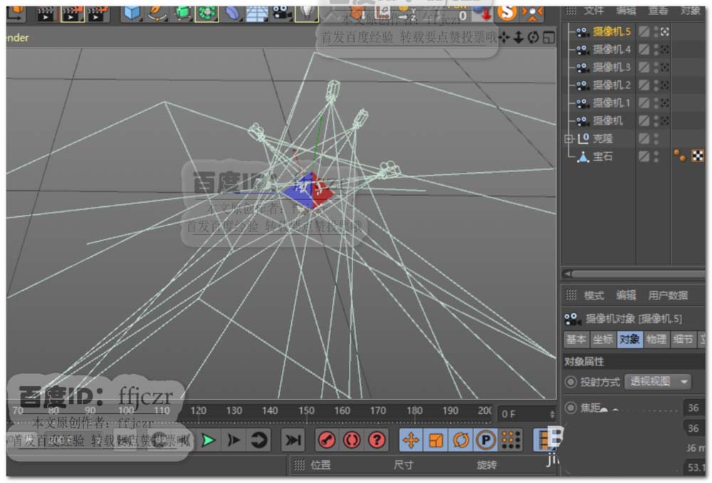 7、给摄像机变换标签中的混合项添加关键帧动画。在0帧时混合值为0,在200帧时混合值为100。这样5个不同视角的摄像机就完成了变换动画,但其变换的速度都是一样的。想要在相应的视角停留一会再快速变换,该如何实现呢?