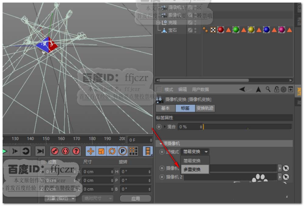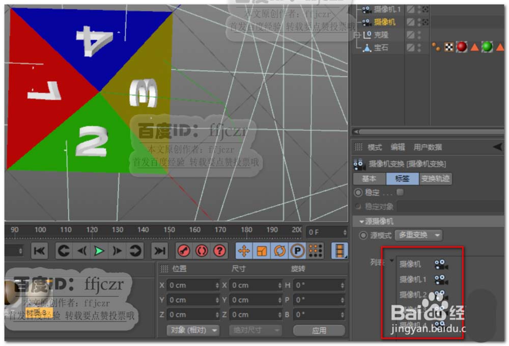 6、在摄像机变换标签的源摄像机项中,源模式更改为多重变换;分别将第2到第4步创建的5个不同视角的摄像机拖到源摄像机项中。