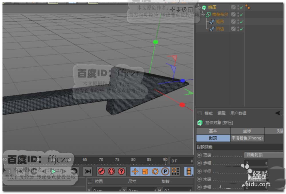 3、给样条布尔添加一个挤压,沿X轴挤压,数值为20;调整对象中的点插值方式为统一,两端圆角封顶,封顶中的类型为四边形,标准网格;使箭头模型的内部网格均匀。如图所示。