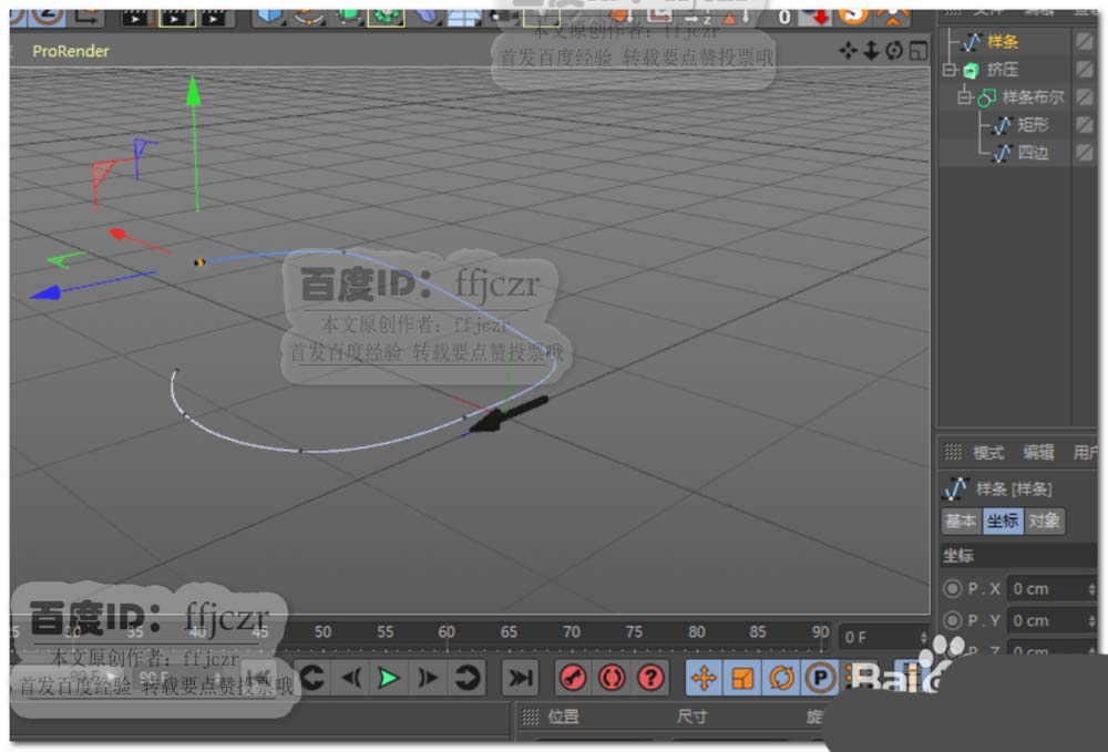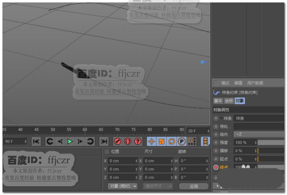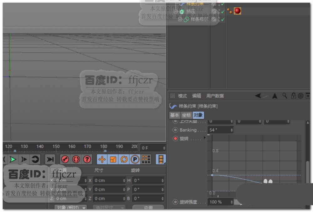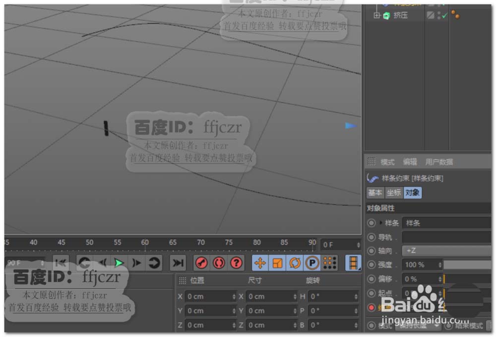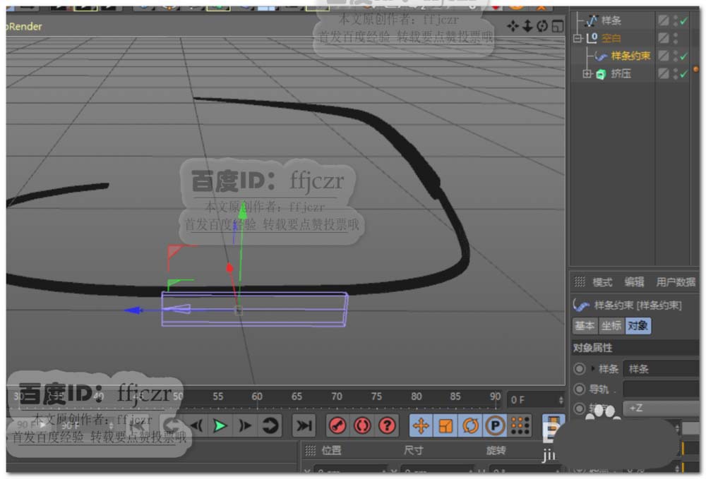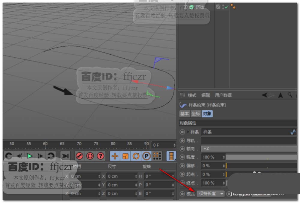 5、将挤压添加到一个空白对象中,给空白对象添加一个样条约束变形器。样条就是上步绘得的路径。更改样条约束对象的模式为保持长度。