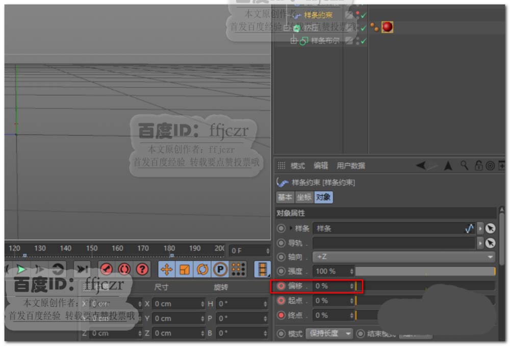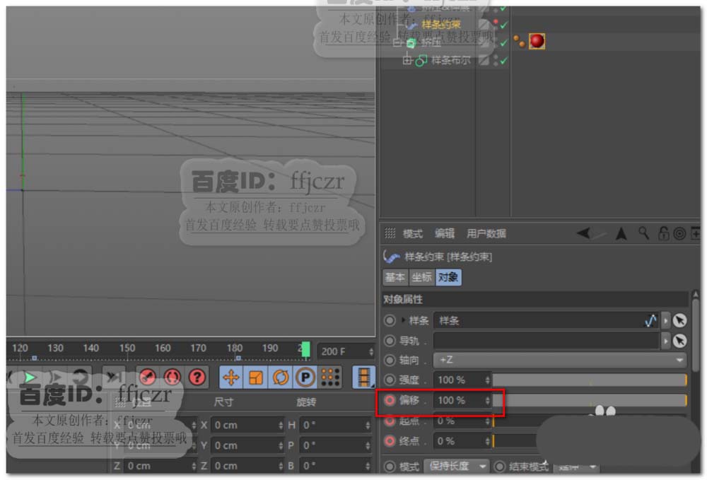 7、创建箭头在路径中移动的动效。给样条约束的偏移项记录关键帧动画。在0帧时偏移值为0,200帧时偏移值为100%。