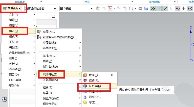 2、如下图所示。执行【菜单——插入——设计特征——长方体】,激活长方体命令。