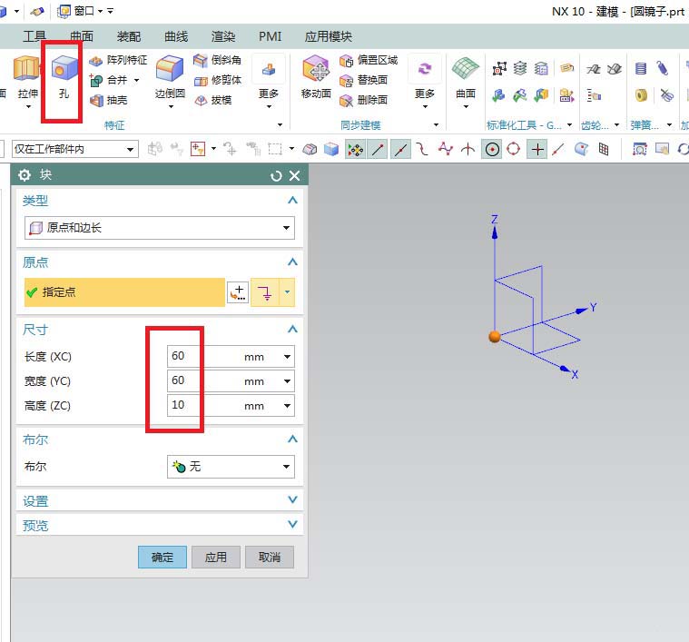 3、如下图所示,软件弹出一个“块”对话框,指定点默认为原点坐标,设置详细尺寸:60x60x10,点击确定。