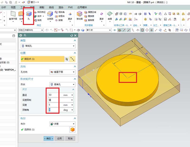 4、如下图所示,点击工具栏中的“孔”图标,及该命令,然后位置指定点,指定为长方体上平面的中点,然后设置详细尺寸,直径:50,深度5,顶锥角:0,点击确定。这个圆孔是镶嵌圆镜片的。