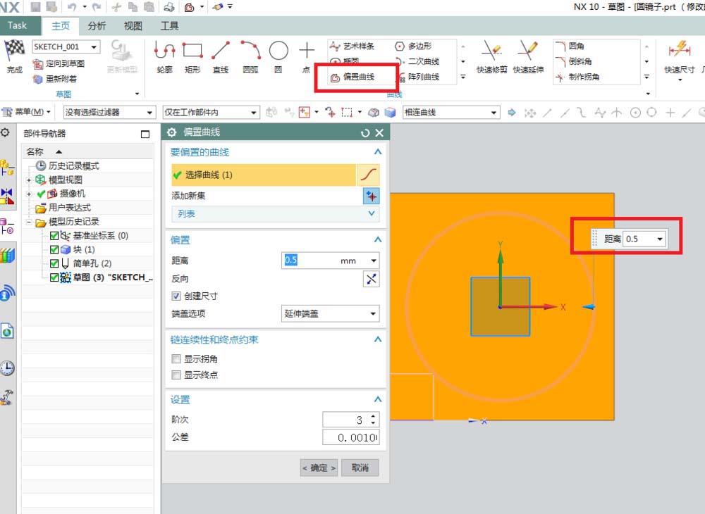 6、如下图所示,进入草图,激活“偏置曲线”命令,然后将圆向内偏移0.5,(这是为了后面渲染看到清楚,实际镶嵌的时候是不能小,只能大的。)然后点击完成,退出草图。