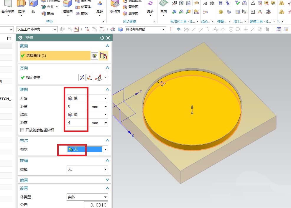 7、如下图所示,回到拉伸对话框,设置详细拉伸尺寸:拉伸高度4,布尔无,点击确定。
