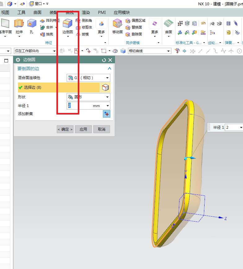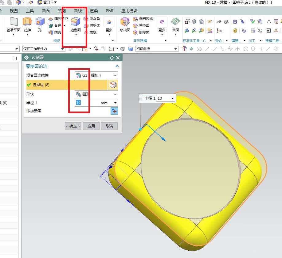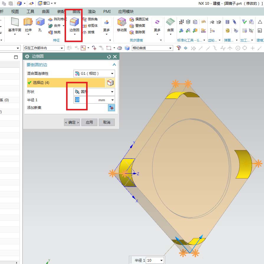 8、如下图所示,单击工具栏中的“边倒圆”图标,激活该命令,然后点击实体中的四条棱边,然后设置半径为10,然后点击“应用”。